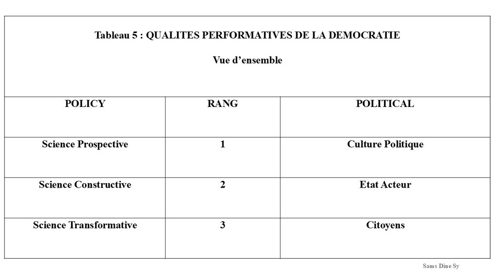 L’étalonnage (Tableau 5) nécessite au préalable une vaste enquête sur la démocratie dans tous les pays suivie d’un approfondissement du cadre conceptuel.
