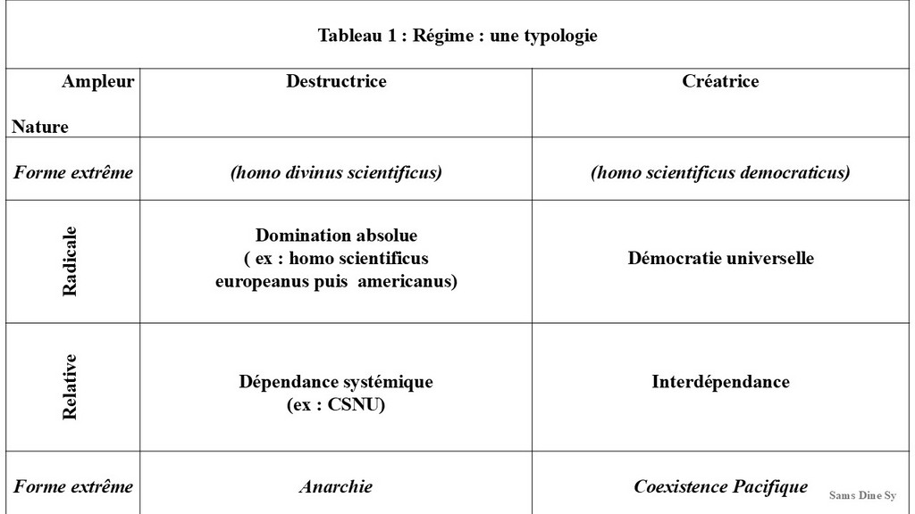La notion de régime employée ici ne renvoie ni au sens commun de type prédicat (alimentaire, matrimoniale...), ni à celui des paradigme en particulier à l'épistémologie politique relative au type d'état ( westphalien, jacobin, présidentiel, parlementaire...), aux attributs de la souveraineté (monétaire, militaire, fiscal, cyber...) encore moins à sa variante ethnolinguistique confessionnelle ou épistocratie. Le régime tel que défini ici est une attitude prospective quand elle anticipe et dans le cas contraire, « tout sauf prospective ». A titre d'exemple, dans le premier cas, l’Onu adopte un régime de type "interdépendance" ou "coexistence pacifique", anticipe chocs, crises y compris "plaques tectoniques" au sens propre et figuré du terme. A défaut, tous les membres de l’Onu sont doublement assujettis à un régime de domination absolue et de dépendance systémique vis-à-vis des Etats-Unis et du CSNU, indépendamment de leur variante relative ou structurelle. (Tableau 1)