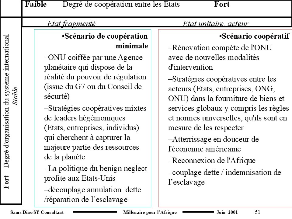Au bout d'un quart de siècle, "atrophie de l’ONU sans remise en cause fondamentale " semble être donc l’hypothèse qui rend le scénario « non coopératif » le plus visible surtout quand elle est associée à une autre : « atterrissage en catastrophe de l'économie américaine » omniprésente dans un contexte hanté par un 3e guerre mondiale.