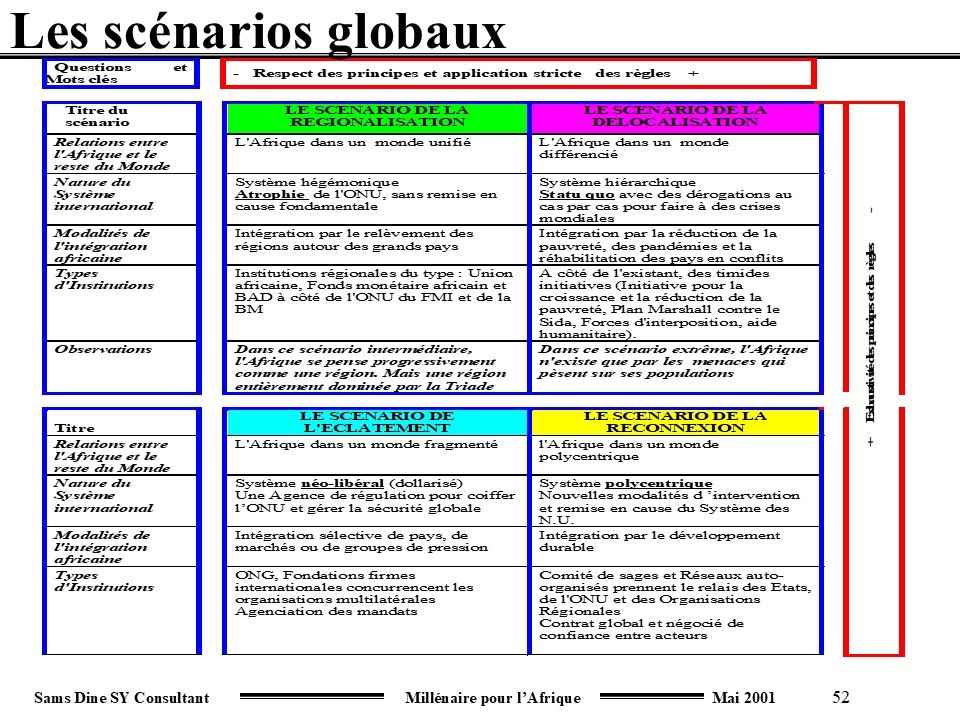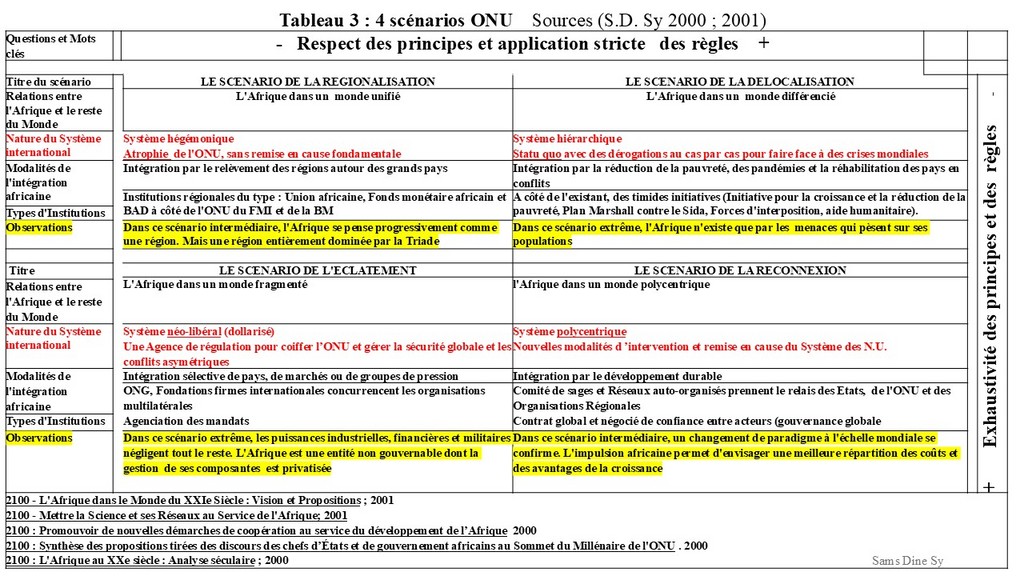 Pourtant, d’autres contributions au Sommet du Millénaire avaient dès l'an 2000 inscrit le monde et le système international dans une échelle d’incertitudes et de réponses (Tableau 3) à l’horizon d’un siècle, localiser l’Onu dans 4 scénarios en vue d'anticiper un XXIe siècle qui s’annonce dès les années 90 plein de ruptures. Des scénarios simplement « craftés » et sans « story telling » compte tenu d’une contrainte de délai élevé (15 jours pour chacune d’entre elles).