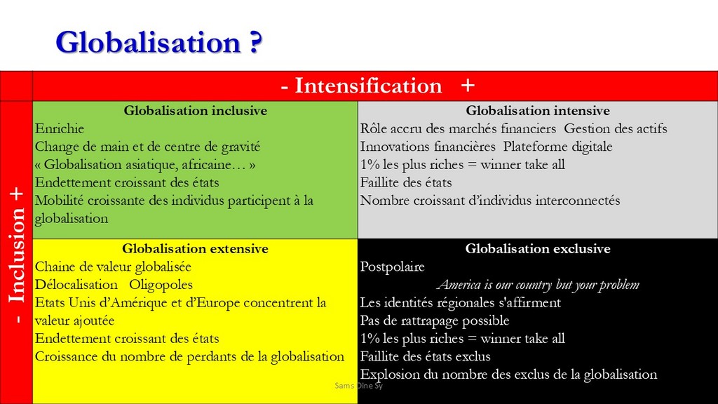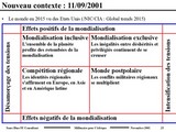 Le double régime - domination absolue et dépendance systémique - fait de l'ONU un enjeu non un acteur capable de relever aussi des défis. La paradoxe est que l'organisation est malgré tout autorisée en 2000 à relever celui de la "mondialisation" présenté comme un trait marquant du XXIe siècle. Une façon subtile de la réduire à une seule forme, d'occulter la précédente et de célébrer la nouvelle. L' intensive ou américaine, symbole de son statut de Hegemon, remplacerait donc l'exclusive ou européenne à l'origine de tant de violence et terreur pendant plus de 2 millénaires.
