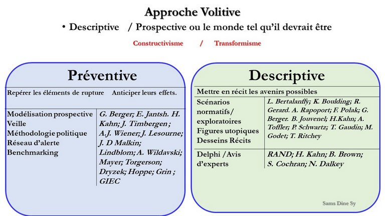 These exercises are part of the humanist vision of foresight that the founding father G. Berger had and dedicate the return to the sources of the four principles that defined it: to see far, to see broadly, to analyze in depth, to take risks. They put foresight back in its rightful place, that of a methodological paradigm whose combination with a constructivist epistemology and a transformative or experimental ontology stimulates the volitive dynamics that supplant the positivist hard core of policy analysis and its normative protective crown in which traditional approach was a part.