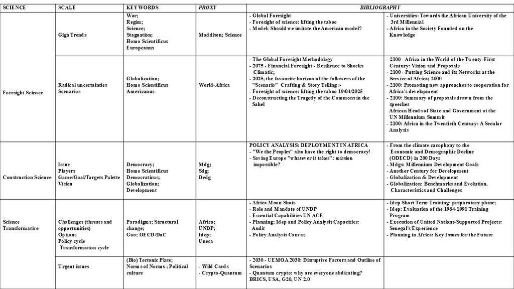 | - La Méthodologie de la Prospective Globale - La Mondialisation : Repères et Evolution, Caractéristiques et Enjeux - 2100 - L'Afrique dans le Monde du XXIe Siècle : Vision et Propositions - 2100 - Mettre la Science et ses Réseaux au Service de l'Afrique; 2000 - 2100 : Promouvoir de nouvelles démarches de coopération au service du développement de l’Afrique - 2100 : Synthèse des propositions tirées des discours des chefs d’États et de gouvernement africains au Sommet du Millénaire de l'ONU - 2100 : L'Afrique au XXe siècle : Analyse séculaire - Prospective Régionale : Afrique Berceau & Précurseur 2075 Prospective Financière - Résilience aux Chocs Climatiques - Prospective Régionale : Afrique Berceau & Précurseur - 2025, horizon préféré des adeptes du « Scenario Crafting & Story Telling » - Prospective de la science : lever le tabou ... | |