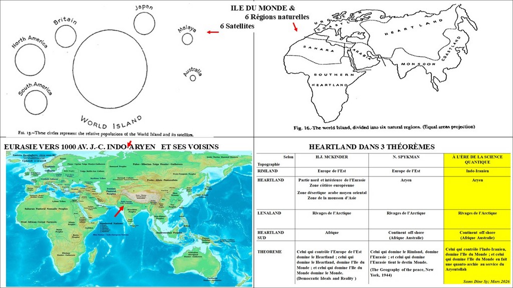 | 3 THEOREMES | 1. Celui qui contrôle l’Europe de l’Est domine le Heartland ; celui qui domine le Heartland, domine l’Ile du Monde ; et celui qui domine l’Ile du Monde domine le Monde. (Democratic Ideals and Reality ) | 2. Celui qui domine le Rimland, domine l’Eurasie ; et celui qui domine l’Eurasie tient le destin Monde. (The Geography of the peace, New York, 1944) | 3. Celui qui contrôle l’Indo-Iranien, domine l’Ile du Monde ; et celui qui domine l’Ile du Monde en fait une quanto-archie au service du Aryentollah Sams Dine Sy; Mars 2026 |